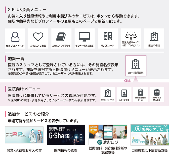開業、承継、学び、情報収集、インフラ整備など、お悩みや課題を多方面から解決するグループサービスです。G-PLUSがすべての歯科従事者をトータルにサポートしていきます。