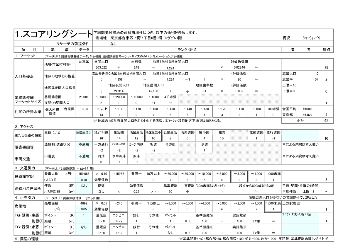 2. 物件・エリア調査 どんな開業も患者さんあっての歯科医院開業です。物件はやり直しがきかないところだけに、来院予想や物件自体の適性など可能な限り調査を行い、適性をスコアリングします。