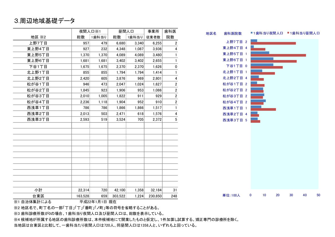周辺地域基礎データ 夜間人口・昼間人口、事務所数、従業員数、歯科医院数などの基本的な地域特性を確認します。